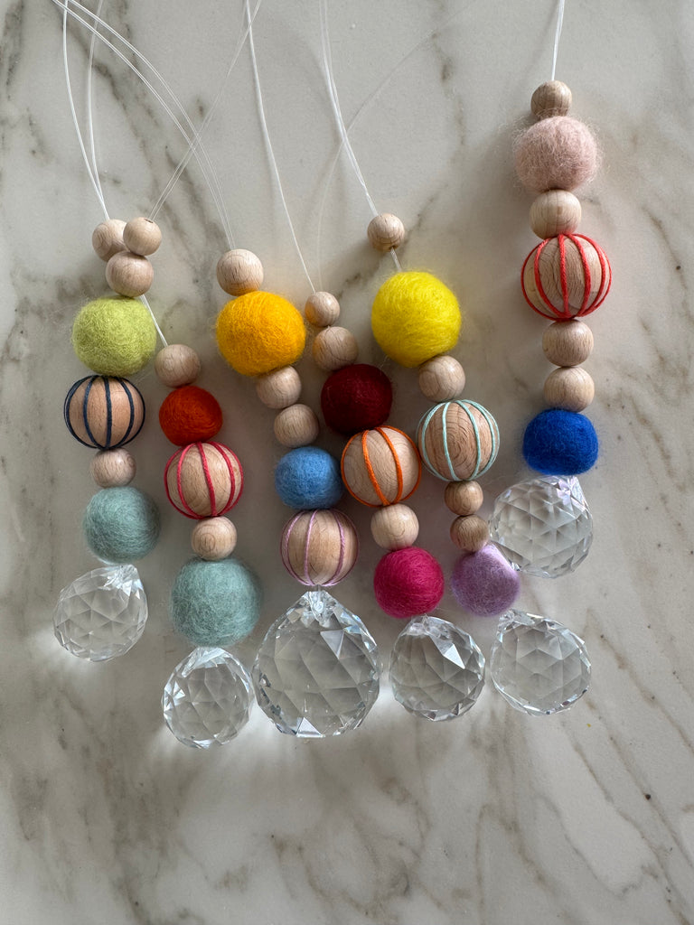 Dieser handgefertigte Suncatcher bringt nicht nur Farbe, sondern auch ein schönes Lichtspiel in dein Zuhause. Der Suncatcher besteht aus handgemachten Filzkugeln, Holzperlen und dem lichtreflektierenden Glassuncatcher (Durchmesser ca. 3,5 cm) – jedes Stück ein Unikat.